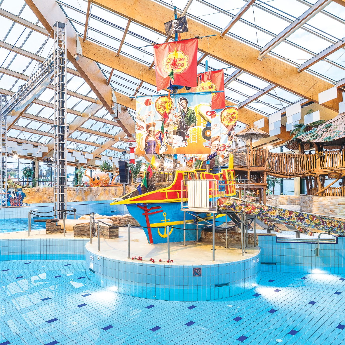 Unter anderem stehen den Gästen sechs Toboggane (der längste ist 140 Meter lang), drei Rutschen, Space bowl, Tauchtubus, Wellenbecken, Wildwasserflüsse, Plantschbecken und Whirlpools zur Verfügung.