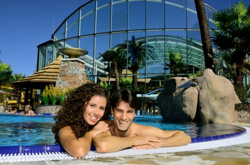 In der Cabrio-Therme Tropicana finden Sie Urlaubsatmosphäre à la Südsee mit einer Vielfalt an unterschiedlichen Thermalpools, von der großzügigen Lagune im Innen- und Außenbereich über den Colorama Meditationspool bis zu den drei Gesundheitsbecken … Und das alles inmitten einer herrlichen tropischen Palmenlandschaft.