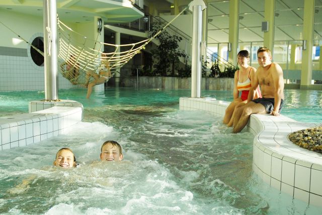 Darüber hinaus bietet die Badelandschaft ein Kinderplantschbecken mit umfangreichen Wasserspielen, Whirlpools zum Relaxen und ein Mehrzweckbecken für Aquafitness sowie Wassergymnastik. Ob Finnische Sauna, Biosaunarium oder römisches Dampfbad, jeder findet seine Lieblingssauna. Die vollständige Erholung bieten ein offener Kaminraum und das Wassersprudelbad, sowie eine original russische Karpatensauna im Außenbereich.