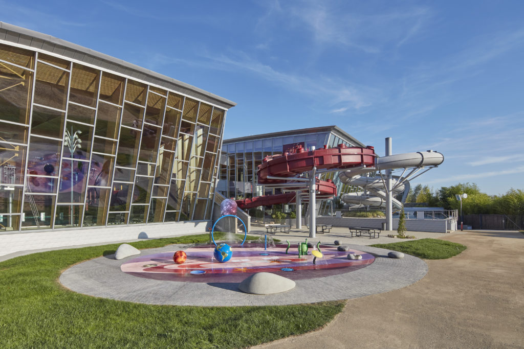 Als wäre in der Nähe von Strassen in der Landschaft eine faszinierende fliegende Untertasse gelandet, so erscheint das Freizeit- und Schwimmzentrum auf den ersten Blick.