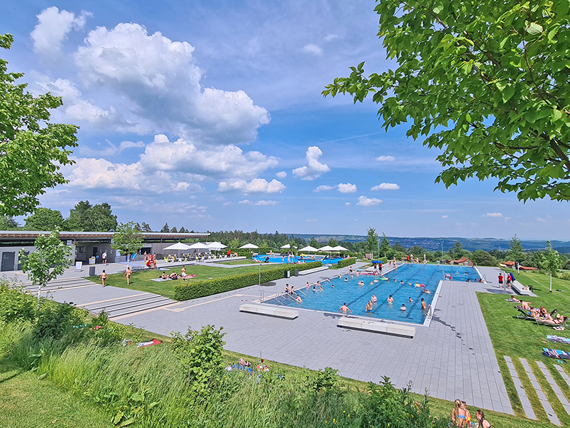 Im angeschlossenen Freibad mit einzigartigem Panorama erwartet die Badegäste in den Sommermonaten ein 50 m-Becken – in einer Kombination aus Schwimmer- und Nichtschwimmerbecken. Hinzu kommen ein eigenes Kinderplanschbecken und ein Kinderspielplatz sowie ein Kiosk. Die Rutschen des Sport & Freizeitbad können auch durch Freibadgäste genutzt werden. Das Freibad ist für alle Indoor-Gäste inklusive und mit den Innenbereichen verbunden – kann aber auch separat gebucht und über einen eigenen Eingang betreten werden.