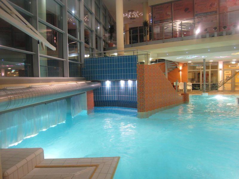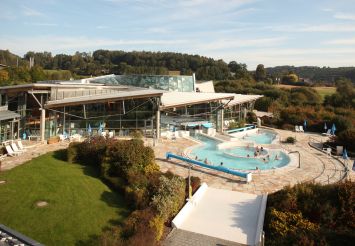 Jung und Alt fühlen sich in der Badewelt mit den großzügigen Innen- und Außenbecken – gefüllt mit heilsamem Thermalwasser aus rund 1.300 Metern Tiefe – so richtig wohl. 90-Meter-Reifenrutsche, Steilrutsche, Meditationsbecken und Dampfbad, Wasserfall, Strömungskanal, Massagedüsen, Spieloase lassen die Zeit dabei wie im Flug vergehen.