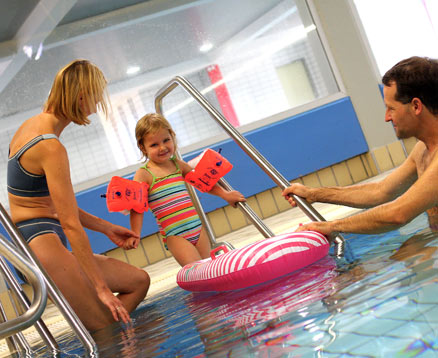 Wasser: Unser 50-Meter-Sportbecken bietet ideale Trainingsbedingungen für Schwimmer. Dazu gibt es einen Sprungturm, einen Kleinkindbereich, ein Lehrschwimmbecken für Kurse sowie zwei entspannende Whirlpools mit Blick ins Grüne.