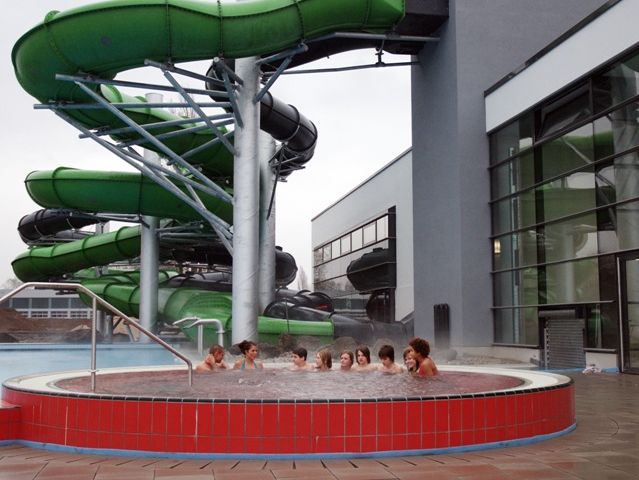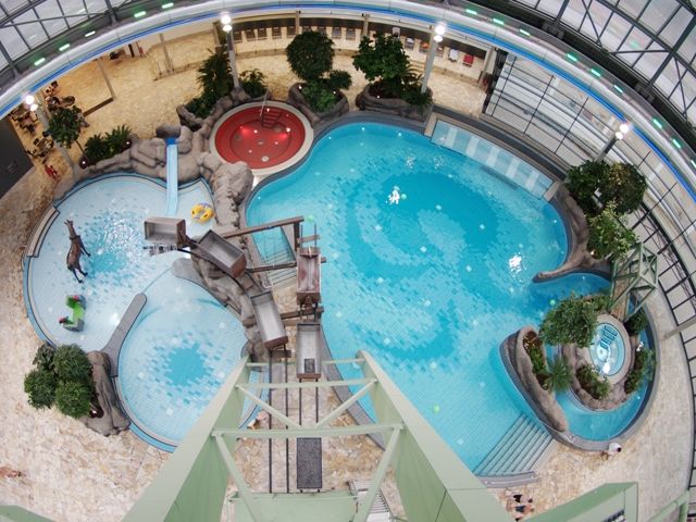 In addition: jacuzzis, a beach volleyball court, an air slide, a trailable glass dome and a spa area as well as baby changing facilities, family changing rooms and a huge free car park. Your children will enjoy the separate baby pool with a temperature of 31 degrees, while you can do watersport courses, chill out in the heated outdoor pool or enjoy the sunbathing on our lawn.