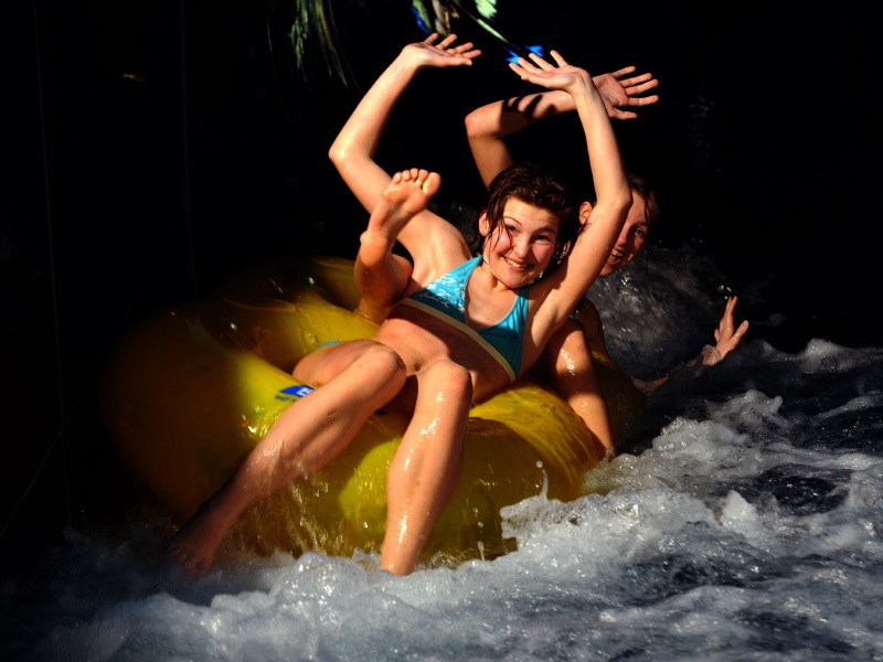 Three slides, wide slide for families, 100 meter Wildwasserfluß for adventure seekers and 170-meter tube slide for all
