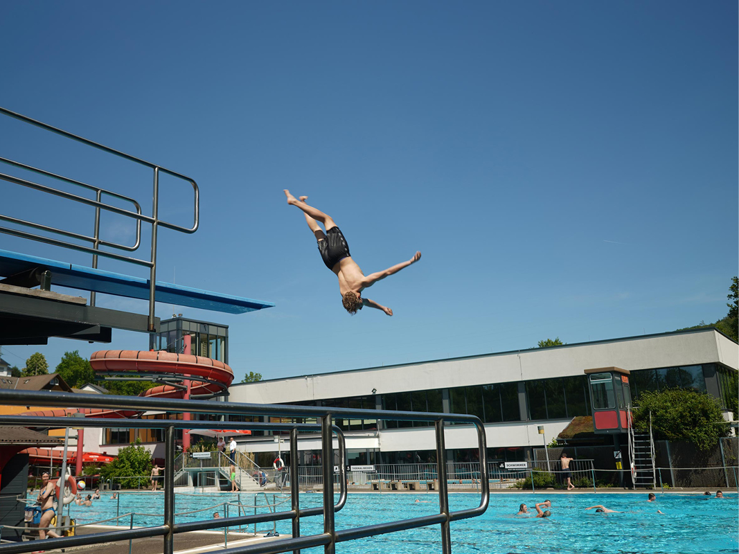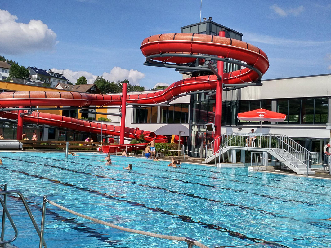 In unserem Freizeitbad findest du alles, was das Herz begehrt – ein modernes Hallenbad mit Extra-Bahn für Sportschwimmer, ein Außen-Thermalbecken mit Massagedüsen, ein großes Freibad mit 50-m-Bahnen und Sprungtürmen, eine spektakuläre 93 m lange Riesenrutsche mit Spezialeffekten, Nichtschwimmer- und Kinderbecken sowie ein Bistro zur Stärkung zwischendrin.