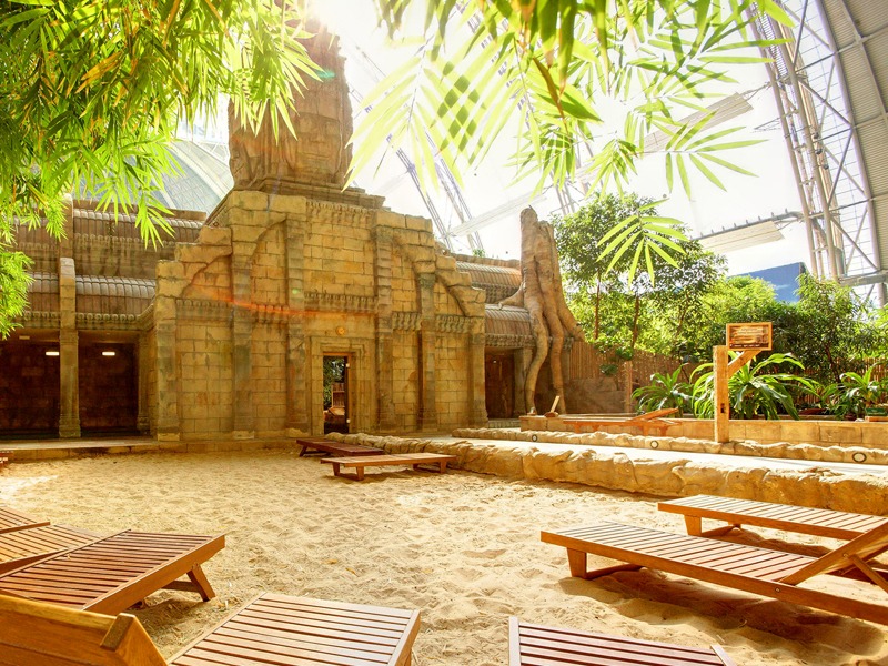 The large tropical wellness area is a special relaxing experience. Six different wellness zones with attractions like a gemstone steam sauna, a blossom steam sauna, a healing earth bath and various aryuveda applications await the visitor. Recreation can be found in relaxation and meditation rooms, solariums and massage proposals. The wellness leisure can be completed by eating light food and drinking healthy drinks in the Sea Shell Beach Café.