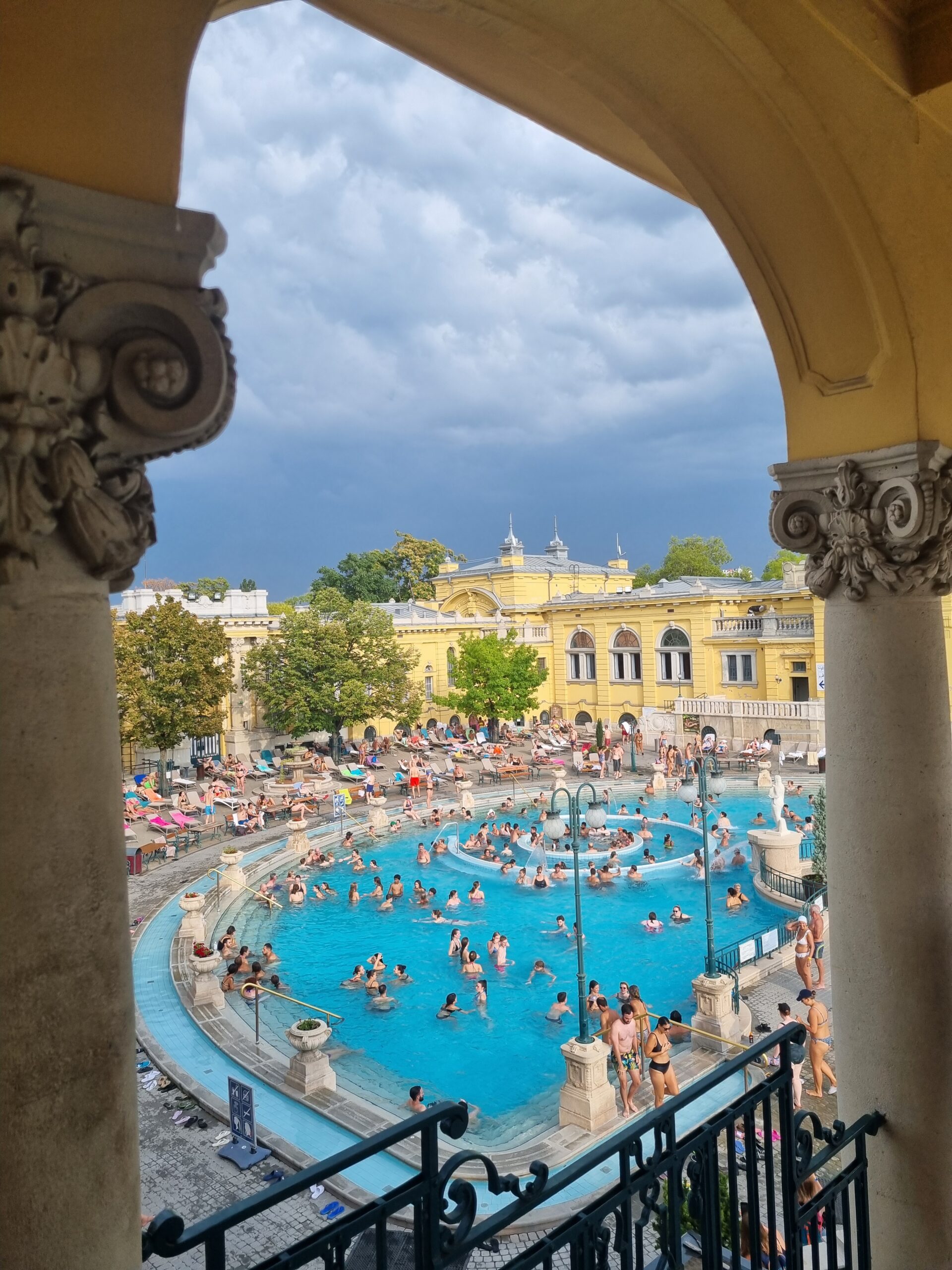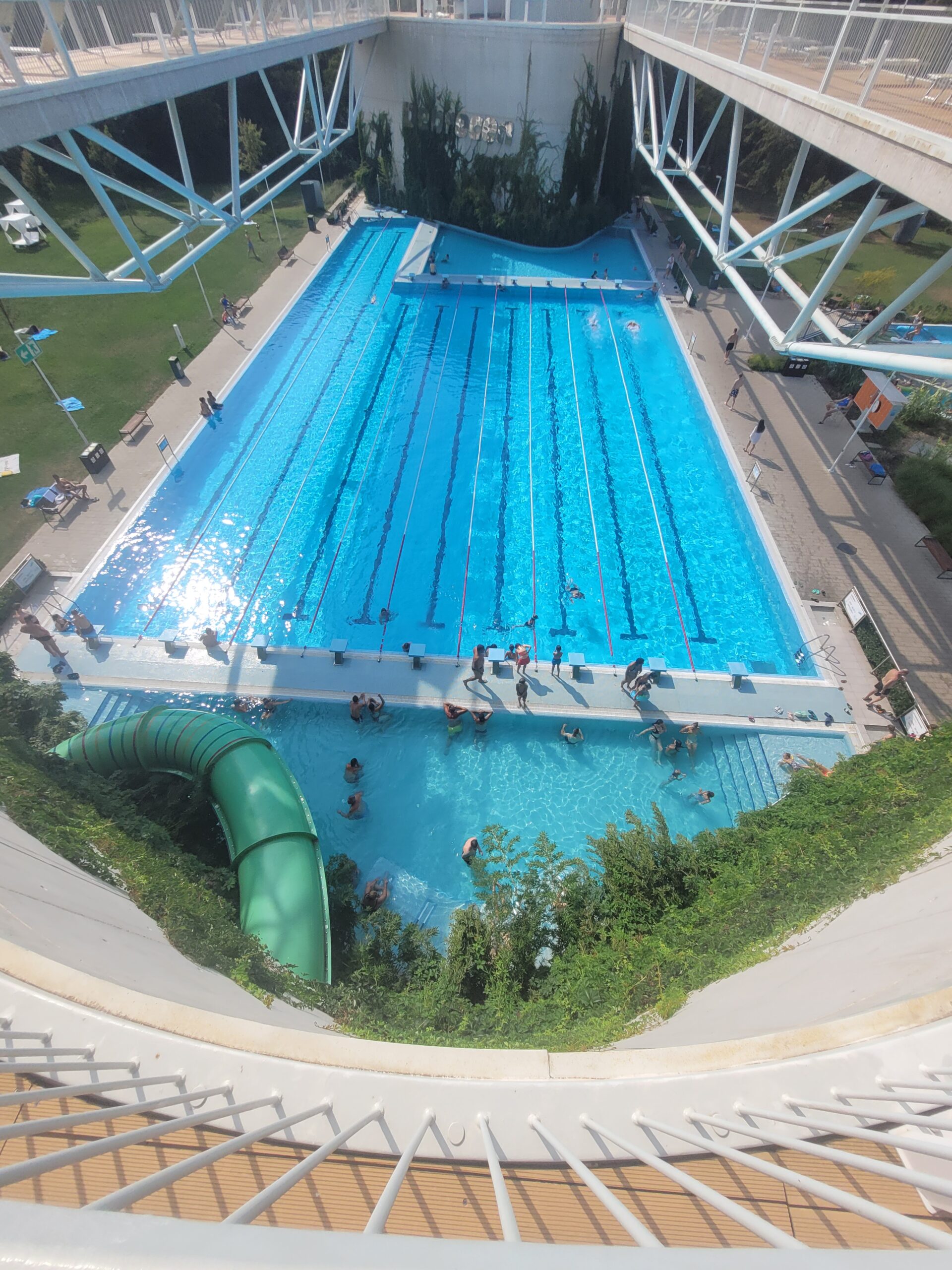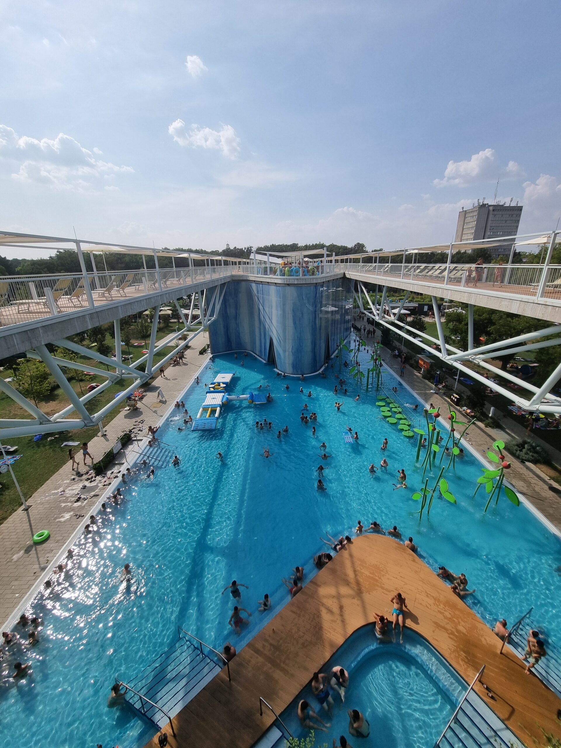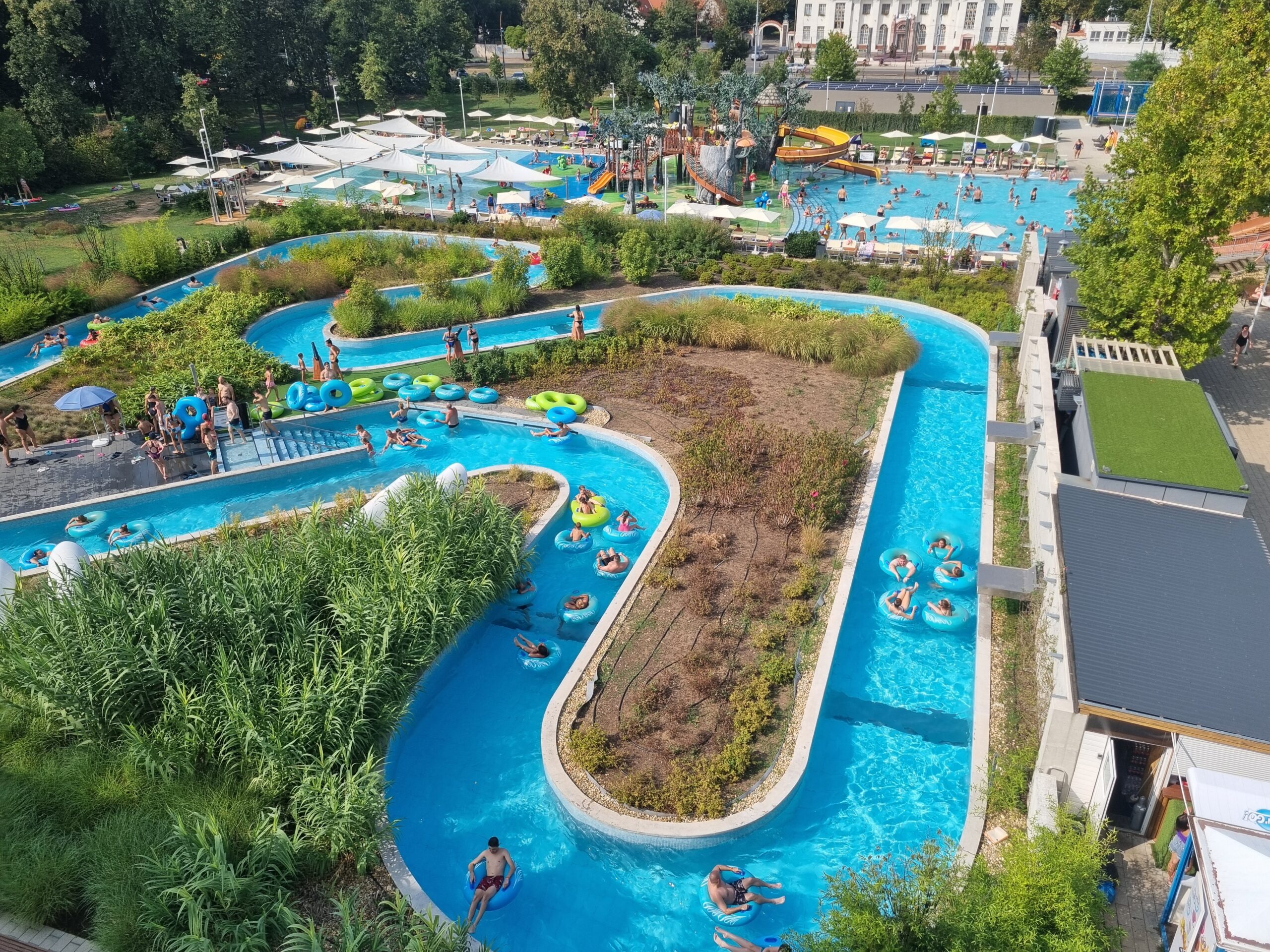 The second day of the study trip took us to Hungary’s second largest city, Debrecen. The city of 200,000 inhabitants is located in the east near the Romanian border and is famous for its traditional university. The Debrecen thermal baths are located right next to the alma mater. The thermal bath has been extended to include a large outdoor water park for families, with attractions designed and built by Eleven Kft. Unusual and probably unique in this form, at least in Europe, is the superstructure of the pools with an elongated sun deck, with which the sunbathing areas have been extended in a spectacular way.