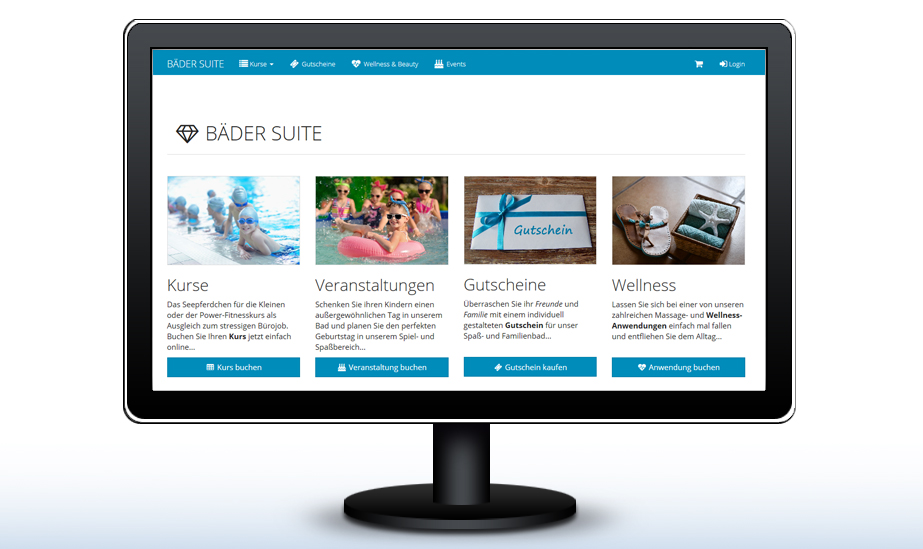 Mit der BÄDER SUITE planen, verwalten und buchen Sie Schwimm- und Aquakurse, Veranstaltungen, Anwendungen, Gutscheine und Wasserflächen einfach online sowie vor Ort. Umsatz und Kundenbindung steigen durch passende Angebote für alle Ihre Zielgruppen – mit weniger Aufwand als bisher.