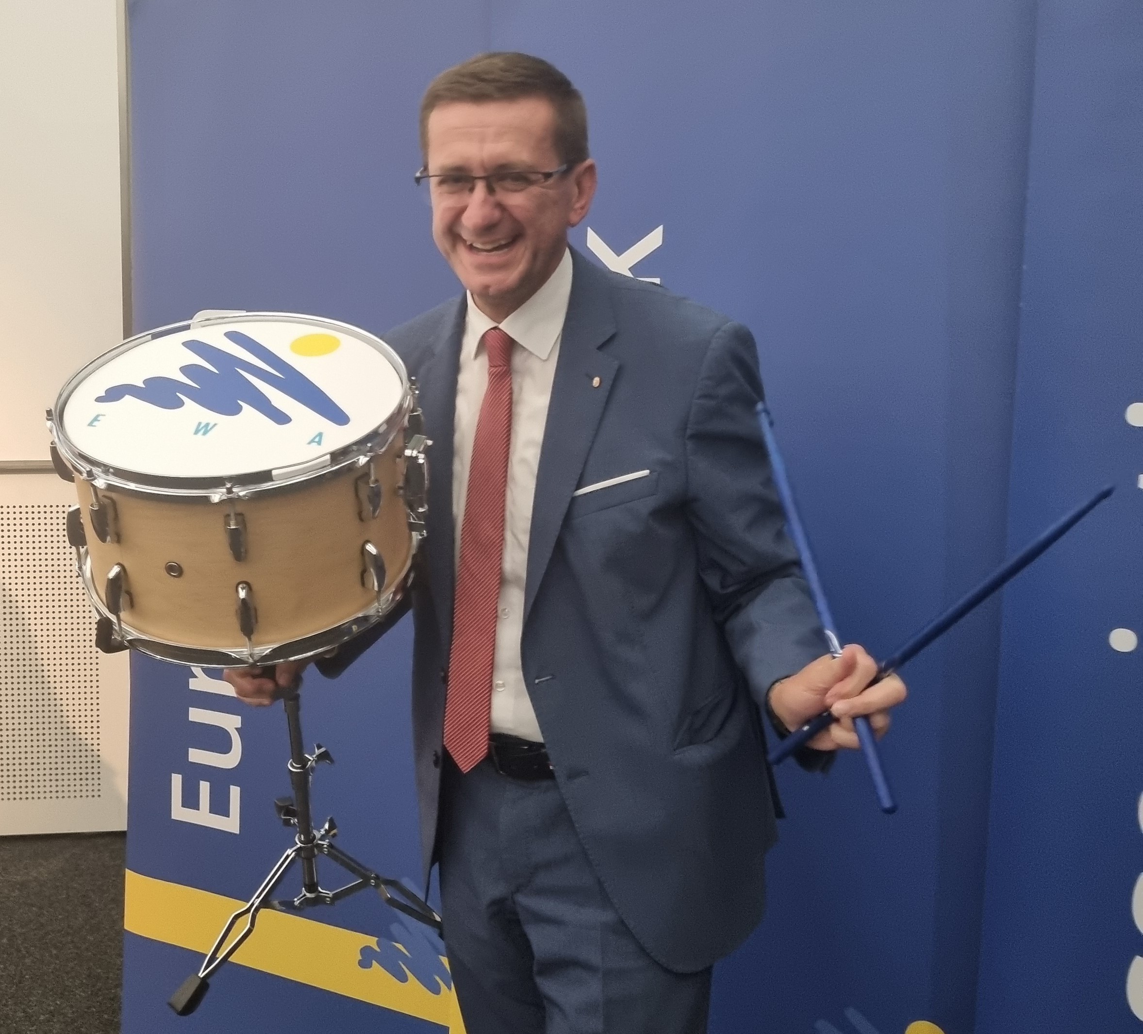 Nach 18 Jahren im Vorstand der European Waterpark Association e.V., davon zwei Jahre als Beisitzer, neun Jahre als Vizepräsident und Schatzmeister sowie sieben Jahre als Präsident des Verbandes, gab der österreichische Wirtschafts-Landesrat sein Ehrenamt am 22. Oktober in den Hände von Jutta Kleiber von Les Thermes in Strassen (Luxemburg). Der langjährige Präsident erhielt zum Abschied eine mit dem EWA-Logo bedruckte Trommel und wurden mit Standing Ovations gefeiert. Achleitner ist seit vielen Jahren Obmann der Trachtenmusikkapelle Neukirchen bei Lambach in Oberösterreich und spielt dort die Trommel – sein Geschick mit den Drumsticks bewies er mit einem kurzen Trommelwirbel!