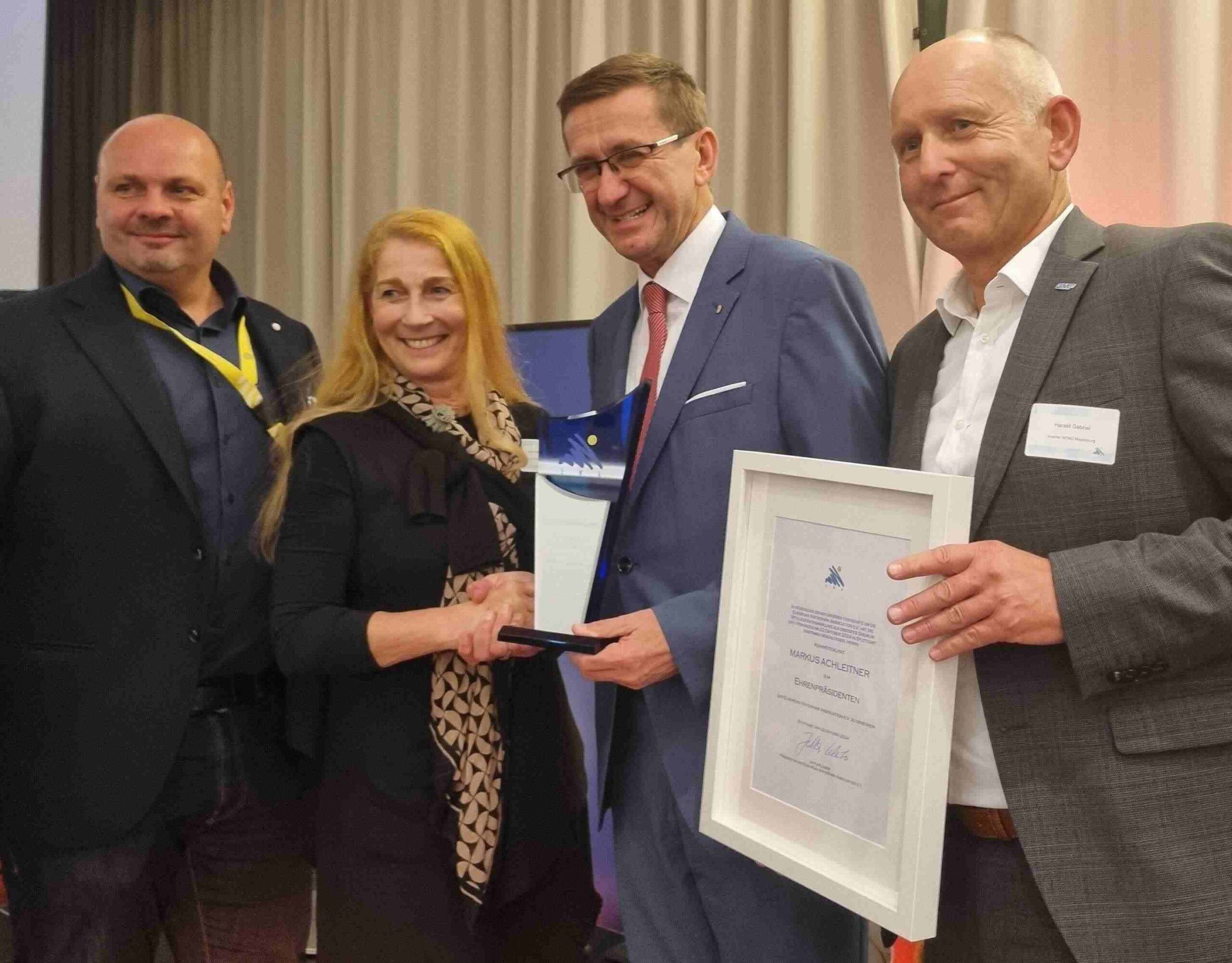 Eine besondere Ehrung wurde Kommerzialrat Achleitner zuteil, als er von der Mitgliederversammlung als oberstem Gremium des Verbandes einstimmig zum neuen Ehrenpräsidenten der EWA ernannt wurde. “Du hast unseren Verband als Präsident geprägt und vorangebracht und zu Recht hat die Mitgliederversammlung heute beschlossen, Dich zum Ehrenpräsidenten der European Waterpark Association zu machen” – mit diesen Worten bat die Nachfolgerin Achleitners beim Festlichen Dinner des Verbandes auf die Bühne und überreichte gemeinsam mit den beiden Vizepräsidenten Harald Gabriel und Andreas Ramsauer dem neuen Ehrenpräsidenten die Ernennungsurkunde und eine Trophäe. Markus Achleitner zeigte sich von der Überraschung berührt und dankte allen EWA-Mitgliedern von Herzen für dieses Zeichen der Wertschätzung.